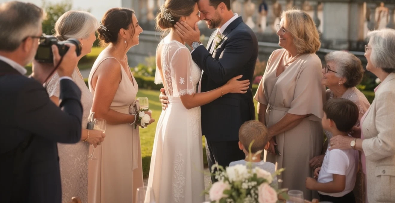 Concrètement, cela se traduit par des compositions en couches, où le couple occupe le premier plan tandis que les parents et grands-parents sont visibles en arrière-plan, parfois légèrement flous mais parfaitement identifiables. C’est un peu comme composer un tableau de famille vivant : chaque personne est à sa place, chaque regard se croise, chaque geste raconte quelque chose. Cette approche produit des images qui, des années plus tard, deviennent de véritables repères pour l’histoire familiale.